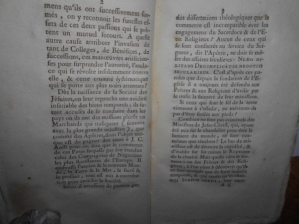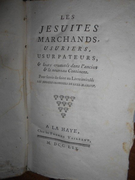 LA HAYE,CHEZ LES FRÈRES VAILLANT, 1759. LES JESUITES MARCHANDS, USURIERS, USURPATEURS. ET LEURS CRUAUTÉS DANS L’ANCIEN & LE NOUVEAU CONTINENT. POUR SERVIR DE SUITE AU LIVRE INTITULÉ: “LES JÉSUITES CRIMINELS DE LÈZE-MAJESTÉ”. IN-16 P. (MM. 180X100), CARTONE OFFICINALE MUTO. VIII,388 PP. L’OPERA CONTIENE DETTAGLIATE INFORMAZIONI SULLE ATTIVITÀ COMMERCIALI DELLA COMPAGNIA DI GESÙ IN AMERICA DEL SUD E IN ASIA; SUL COMMERCIO MARITTIMO, LE MISSIONI IN FILIPPINE, INDIA, CINA E GIAPPONE, LA DISTRUZIONE DELLE MISSIONI IN CINA DI CUI I GESUITI FURONO ACCUSATI DA UN ANONIMO, LE MISSIONI IN PARAGUAY, LA PERSECUZIONE DEL VESCOVO PALAFOX, ECC. UN COPIOSISSIMO INDICE CHIUDE QUESTO VIOLENTO TESTO, STAMPATO NELL’ANNO IN CUI L’ORDINE FU SCACCIATO DAL PORTOGALLO (IL 21 LUGLIO 1773 FU SOPPRESSO UNIVERSALMENTE DA CLEMENTE XIV). RARA "EDIZIONE ORIGINALE". SCONOSCIUTO AL BARBIER. CASA