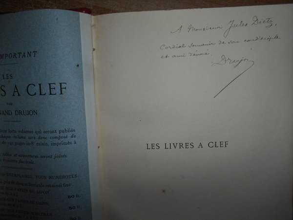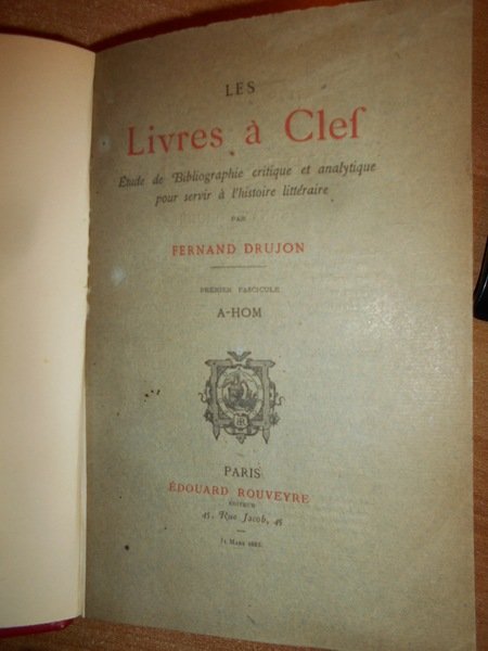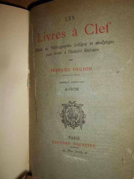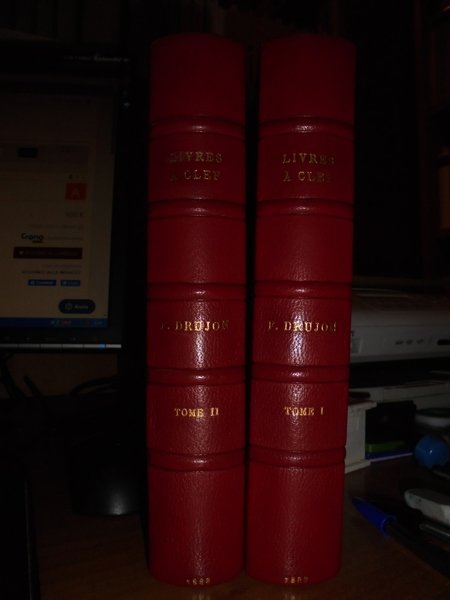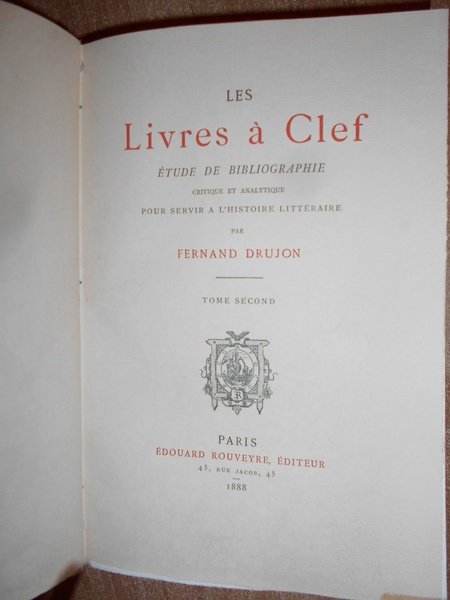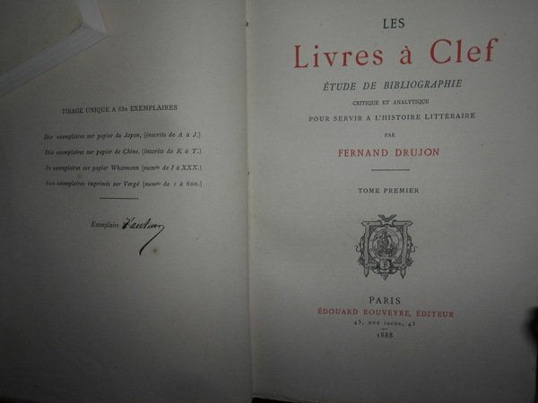 FERNAND, DRUJON. Paris, Edouard Rouveyre éditeur, 1888. Les Livres à Clef étude de Bobliographie critique et analytique pour servir a l' Histoire Littéraire. Edizione originale. 2 volumi in-8°, m. marrocchino con angoli, dorsi a nervi con titoli in oro, copertine originali conservate. xvi, complessive 1355 pp. Bellissimo esemplare non rifilato in legatura di pregio con le brossure originali conservate impreziosito da una dedica all' occhietto firmata dall' Autore. Uff. E - II - 2