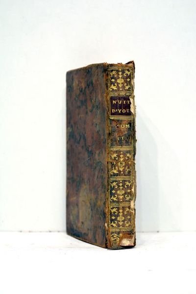 Tome second seul. 307 pages. (15x8,5cm). Pleine basane du temps. Dos lisse orné. Pièce de titre maroquin rouge. Filet doré sur les coupes. Tranches rouges. Gardes de papier marbré. Reliure usagée. Dos frotté. Accidents aux coiffes. Manques de cuir sur le dos et sur les mors. Charnières fendues. Quelques frottements et taches sur les plats. Coupes élimées. Infimes rousseurs et défauts d'usage à l'intérieur. Intérieur agréable. Petit exemplaire particulièrement frais dans une reliure du temps qui mérite une grande restauraiton. Ce deuxième tome contient les nuits XIV-XXIV et une série de réflexions: Le jugement dernier, le triomphe de la réligion, paraphrase du Livre de Job, Epître à Voltaire, revue de la vie, pensées sur differents sujets, Eufebe ou le riche vertueux et la résignation.