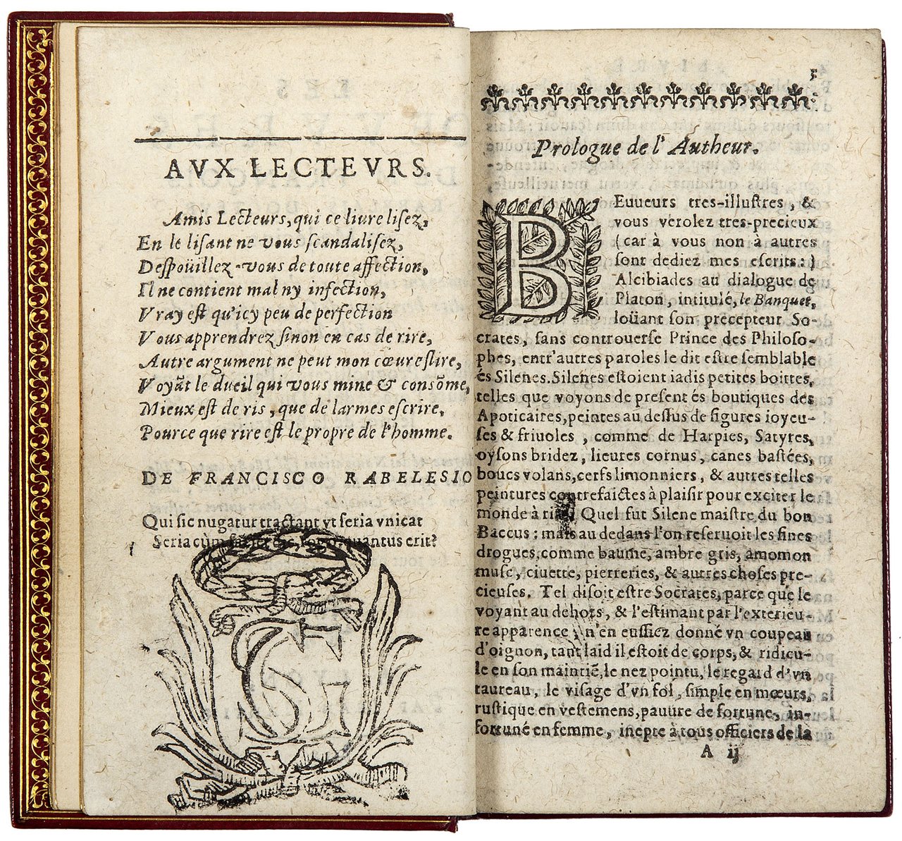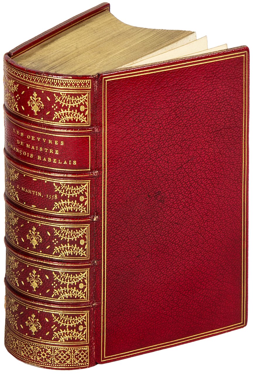 Tre parti in un volume in 12mo (mm. 134x74); marocchino rosso, piatti entro duplice filettatura dorata, dorso a cinque nervi con ricchi fregi e titolo in oro, risguardi in carta marmorizzata, tagli dorati (Masson-De Bonnelle); pp. 347, [7] + pp. 469, [9] + pp. 166, [32]. Segnatura: A-Z12 Aa-Vv12. Manca l'ultima carta Vv12 bianca. Legno con Dive Bouteille alla c. Tt3r. Timbro con le iniziali “SG” intrecciate al verso del titolo. Sul risguardo posteriore nota a matita “Salle Drouot Giraud-Badin 11 juin 1957 Frs. 103,000.”. Ottima copia.