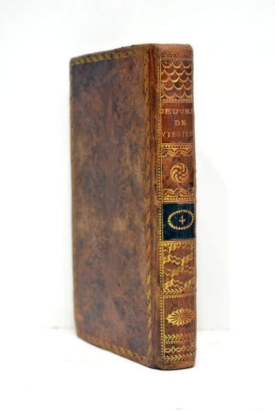 Tome 4 seul. 329 pages. (16,5x9,5cm). Pleine basane de l'époque au dos finement décoré. Pièces de titre et tomaison. Encadrement doré sur les plats. Gardes de papier marbré. Coiffes un peu élimées. Petits travaux de ver sur le dos. Quelques frottements et défauts d'usage à la reliure. Intérieur bruni. Rousseurs éparses. Quelques défauts d'usage. Bon état. Petit volume bien relié en pleine basane du temps au dos finement décoré. Ce volume contient les livres IX-XII de l'Enéide. Texte bilingüe latin-français en regard.