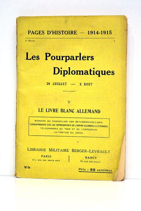 Tome 5 seul. 77 pages. 1 feuillet. (17x11,5 Cm). Broché. Couverture imprimée en couleur. Plis angulaires. Couverture un peu salie. Papier un peu bruni. Exemplaire bien conservé. Mémoire et documents se référant aux évènements qui ont précédé la déclaration de guerre.