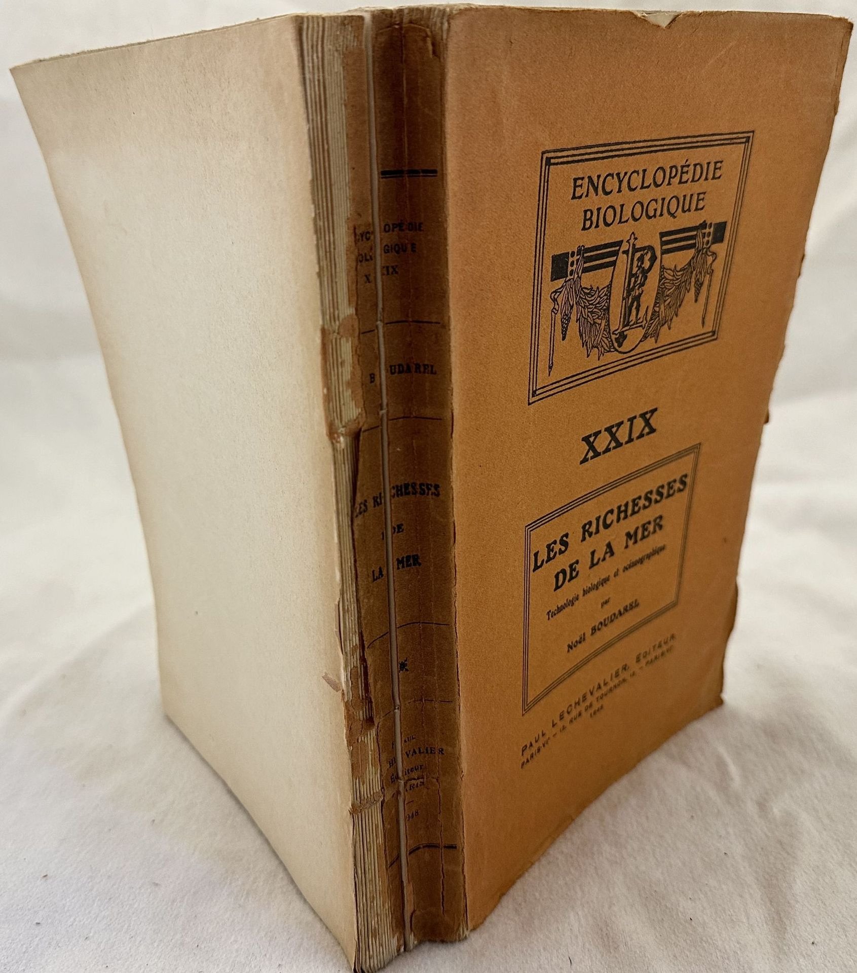 Edizione del 1948 di questa opera di biologia marina scritto da Noel Boudarel. All'interno: Aspetto degli oceani, Composizione dell'acqua del mare, Movimenti del mare, La via dentro gli oceani, Le alghe, Produzioni di origine animale, pesca, Vari tipi di pesca, Le Conserve e le industrie annesse ec. Numerose illustrazioni nel testo. In discrete condizioni. Copertina editoriale in discrete condizioni generali con usure ai margini e dorso. Piatto posteriore assente. Legatura in discrete condizioni con qualche lieve rottura. All'interno le pagine si presentano in buone condizioni con rare fioriture. In 8. cm 25,5x16,5. Pp. 548+(3). Edition of 1948 of this work of sea biology written by Noel Boudarel. Different illustrations in the text. In fair conditions. Editorial cover in fair general conditions lightly worn in the extremities. Back plate lacks. Binding in fair conditions with some light crack. Inside pages are in good conditions with occasional foxing. In 8. cm 25,5x16,5. Pp. 548+(3).
