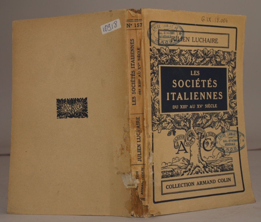 In 16. Dim. 17x11,5 cm. Pp. 214. Collection Armand Colin. 5 mappe. Interessante studio di Julien Luchaire sulle società e comunità italiane dal XIII secolo fino alla fine del XV secolo che andavano in qualche modo contro il governo. Copertina editoriale originale in discrete condizioni generali con parti amncanti al dorso. Rare fioriture. 5 maps. Interesting study by Julien Luchaire about italian societies and communities from the XIII century until the end of XV century that went against the government. The author analyzes all Italy from the South to North. Editorial original cover in fair general conditions with missing parts in the spine. Occasional foxings.