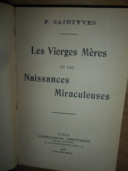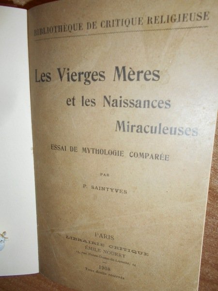 P. Saintyves. Paris, Librairie Critique Emile Nourry, 1908. Les Vierges Mères et les Naissances Miraculeuses. In-16°, tela con titolo in oro al dorso, copertine originali conservate. 280, (6) pp. In ottimo stato di conservazione. Neg. mob. nero W.