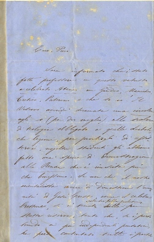 Lettera autografa firmata, su due facciate, datata: "Pisa 19 marzo 1861", indirizzata data la provenienza - a Piero Puccioni: "Caro Piero, Sarai informato che è stato fatto professore in questo vetusto e celebrato Ateneo un Giudeo, Manicheo, Eretico, Paterino e che so io! Il Vescovo avendo diramato una circolare agli o (per dir meglio) allo scolaro di teologia obbligato a quelle diaboliche lezioni, per proibirgli di assistere, nojaltri studenti gli abbiamo fatto una specie di dimostrazione alla Rendu che è riuscita più che benissimo. Se non che il nostro orientalista invece di dimostrare l'umanità di Gesù Cristo come il celebre brettone si è tenuto, nella sua bella prolusione, della più stretta riserva, tanto che, se è parso timido ai più