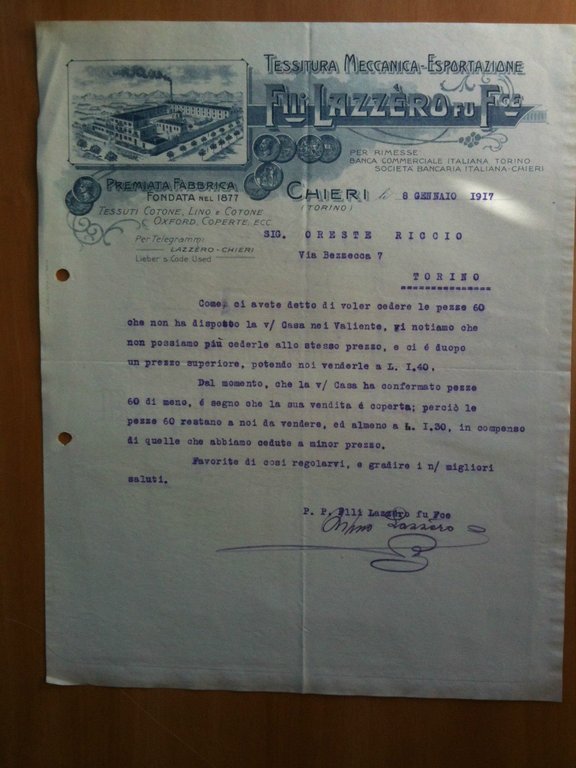 F.LLI LAZZERO FU F.ce Chieri (TO)Tessitura Meccanica - EsportazioneTorino 8 gennaio 1917formato 22,5x28,5 cmin buone condizioni e1460
