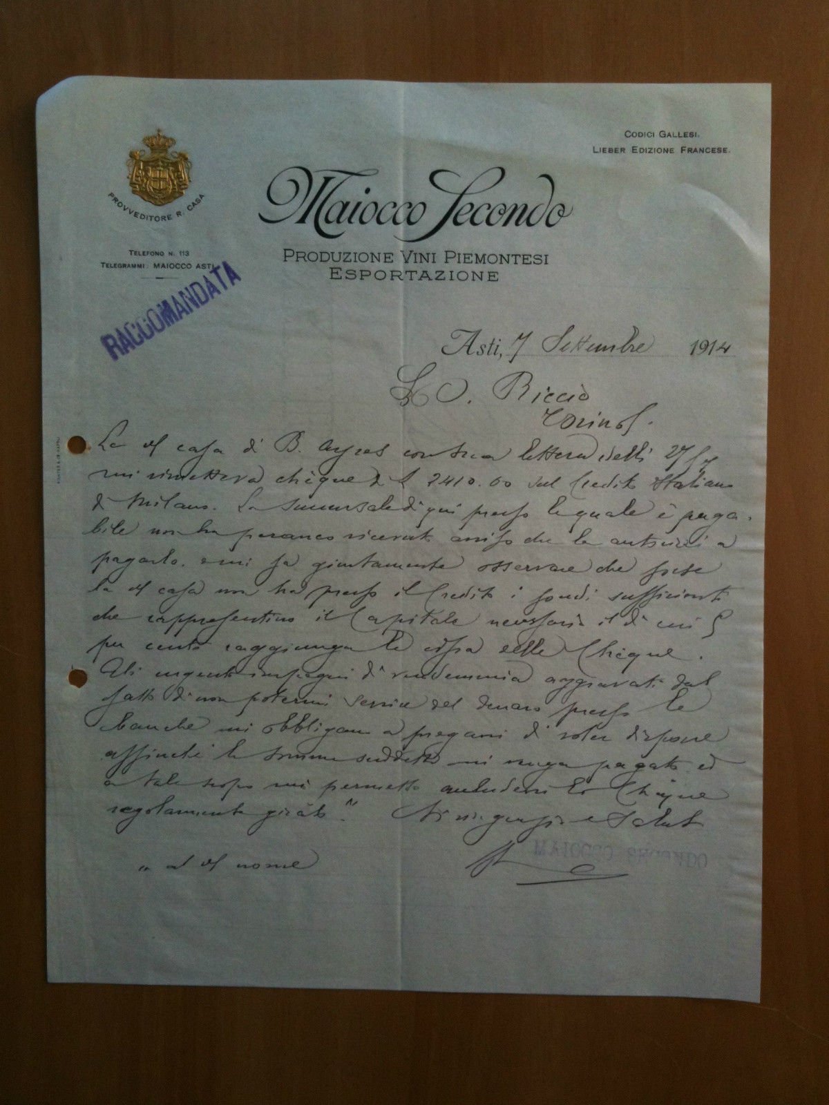 MAIOCCO SECONDOProduzione vini piemontesi esportazioneAsti, 7 settembre 1914formato 21,5x27,5 cmin buone condizioni e1541