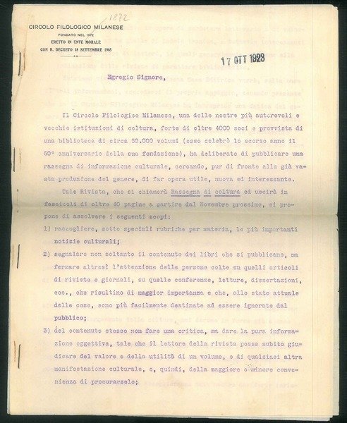 <p>Lettera dattiloscritta di 3 pagine, timbro con la sua firma in calce su carta intestata di un circolo filologico milanese. Le 3 pagine sono un'informativa sulle finalità e funzionamento del circolo. Timbro con data 17 ottobre 1923 applicata all'ultima c.b. Busta di spedizione alla tipografia Guidetti di Reggio Emilia.</p>