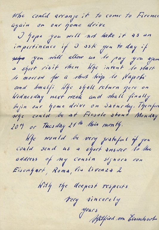 Lettera manoscritta autografa, firmata, stesa su due facciate, datata "Velletri 17 Juni 1955". In lingua inglese. Destinatario non esplicitato (ma probabilmete il conte Giuseppe della Gherardesca). Eisenhart ringrazia il conte di averlo accompagnato nella scoperta di Firenze e dei suoi magnifici dintorni e gli preannunzia una nuova breve visita sulla via del ritorno.