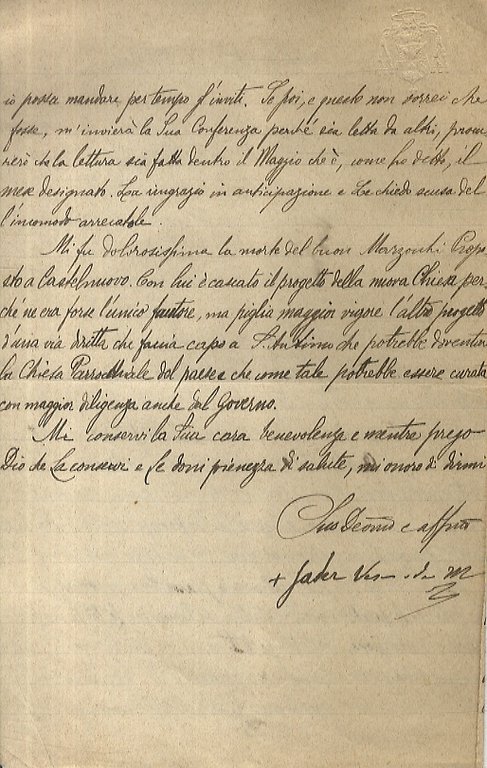 Lettera manoscritta in chiarissima grafia (forse di segretario), con firma autografa del vescovo (Jader vesc. di M.), stesa su due facciate su carta recante un piccolo stemma vescovile impresso a secco. Indirizzata, data la provenienza, al professor Antonio Canestrelli, datata: "Montalcino 25 aprile 1904". "Mio egregio e riverito Sig. Professore, quand'ella ebbe la bontà di scrivermi che era disposto a mandarmi una Conferenza da leggersi ai Montalcinesi sul S. Antimo, io ne fui così lieto che più non avrei potuto. E lo feci sapere a questo buon popolo maschile e femminile che sta ora aspettando a gloria di sentirsi narrare ciò che, purtroppo bisogna confessarlo, non sa o sa pocchissimo. [.] Io ho promesso che la conferenza sarà letta nel