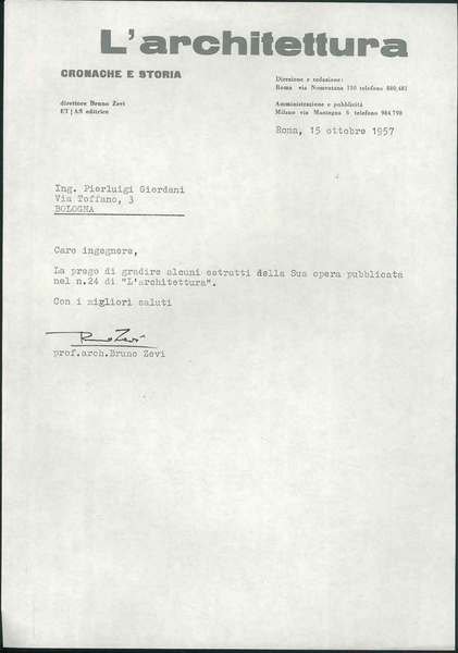 Lettera su carta intestata di rivista datata Roma, 15 Ottobre