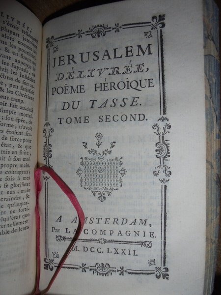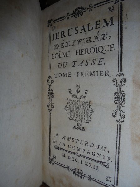 (Letteratura) TASSO, Torquato. Jerusalem délivrée. (Gerusalemme Liberata). Poème héroique. Amsterdam, par La Compagnie, 1772. 2 volumi in-8° legati assieme in pelle coeva, dorso a 4 nervetti con fregi floreali in oro e titolo su tassello, taglio marmorizzato. Complessive LX, 394 pp. L' opera è preceduta da una biografia del Tasso. Bell' esemplare della traduzione francese. Neg. natura mob. 22.