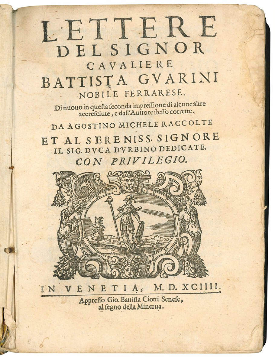 “La prima edizione delle Lettere del Guarini, curata da quel letterato di Venezia Agostino Michele di cui Ciotti aveva già pubblicato nel 1592 un Discorso in cui, contra l'opinione di tutti i più illustri scrittori dell'arte poetica, chiaramente si dimostra, come si possono scrivere con molta lode le comedie e le tragedie in prosa, fu pubblicata dal Ciotti nel 1593, con altre edizioni nel 1594, 1595, 1596, 1598, 1600, 1603, 1606 e 1615. Ciotti aveva il monopolio delle Lettere come anche delle Rime” (D.E. Rhodes, Guarini e l'editore Giovanni Battista Ciotti, in: “Rime e lettere di Battista Guarini. Atti del Convegno di Studi Padova, 5-6 Dicembre 2003”, B.M. Da Rif, ed., Alessandria, 2008, p. 339). The collection contains 158 letters dating from June 1565 to August 1593 (nine of which are by other authors: seven are addressed to Guarini and two to other recipients).