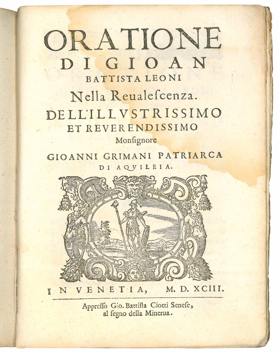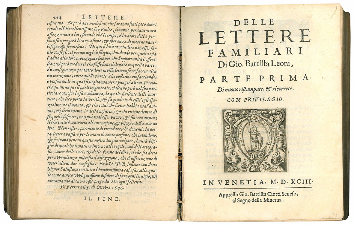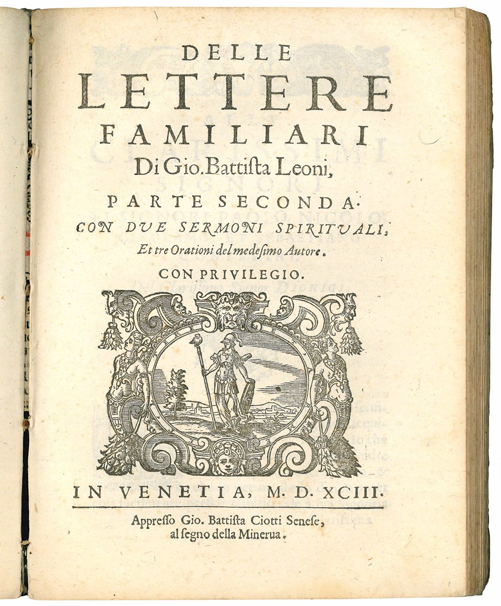 [Bound with:] LEONI, Giovanni Battista (1553-1609). Delle lettere familiari [...] parte prima [-seconda]. Con due sermoni spirituali et tre orationi del medesimo autore], di nuovo ristampate et ricorrete [sic]. Venezia, Giovanni Battista Ciotti, 1593. [together with:] IDEM. Oratione […] nella revalescenza dell'illustrissimo et reverendissimo monsignore Gioanni Grimani Patriarca di Aquileia. Venice, Giovanni Battista Ciotti, 1593.