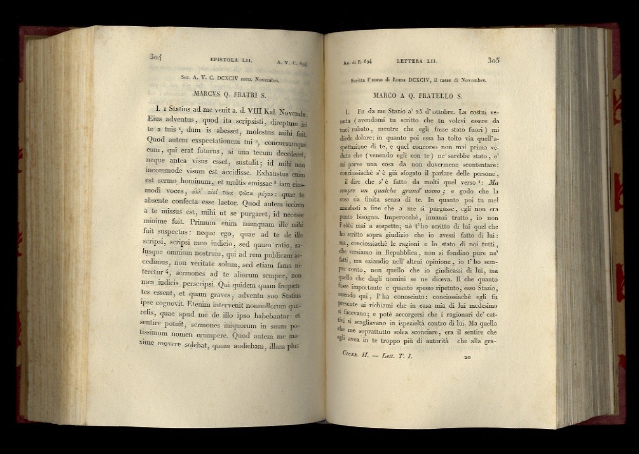 Milano, presso A.F. Stella, 1826 - 1826 - 1827 - 1829, voll. 4, in-8, legatura moderna in mezza tela con punte, conservate all'interno le copertine delle brossure editoriali (al volume VI solo quella anteriore), pp. [8], XXXVI, 546 - [2], 546, [2] - [2], 533, [3] - [8], 639, [1]. Con una pianta topografica del golfo di Napoli incisa in rame ripiegata nel volume I. Frontespizi anche in latino che riportano: curante Francisco Bentivoglio. Testo originale a fronte. Solo quattro volumi delle Lettere, sui dieci complessivi di questa edizione (la quale faceva parte d'una edizione delle Opere).