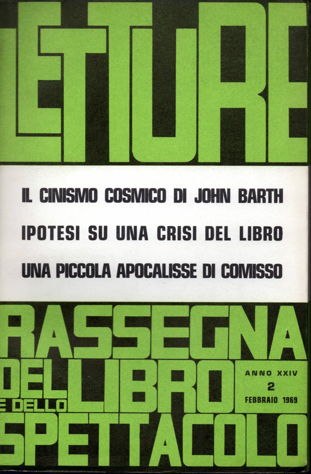 LETTURErassegna critica del libro e dello spettacoloANNO XXIV n^2 Febbraio 1969Il cinismo cosmico di John BarthCharles Baudelaire, Lettere inedite ai famigliariStanley Kubrick, 2001 odissea nello spazioJean Luc Godard Due o tre cose che so di leiSergio Leone, C'era una volta il WestUgo Liberatore, Bora bora in buono stato (gr.250)e327