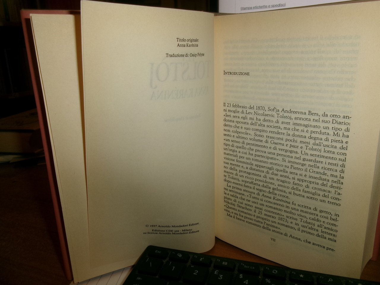 LEV Tolstòj. Classici. Anna Karénina. Traduzione di Ossip Felyne. Milano, Arnoldo Mondadori, 1996. In-8°, cartonato edit. con sovracopertina ill. a col. xvii, 1029, (1) pp. Ottimo stato. Neg. mob. bianco comput.