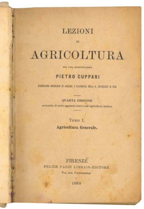 Tomo I, Agricoltura generale, e II, Agricoltura speciale, in un volume. Mm. 181x115. Pp. XII, 347, [1]; XI, [1], 446, [2]. Con piccole figure in b/n nel testo, c. lievemente ed uniformemente brunita. Rilegato in mezza pergamena editoriale (mancanze ai piatti e alle cerniere). Quarta edizione.