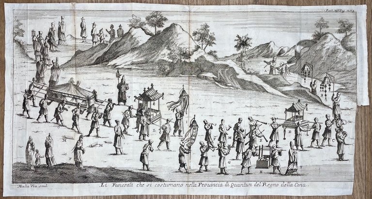 [Venezia], [presso Giovanni Malachin], [1719], incisione in rame di mm. 250x473(l'impronta della lastra), mm. 265x480 (il foglio). Firmata in lastra in basso a sinistra: "A. Dalla Via scul.". Tavola proveniente dal volume quarto del "Giro del mondo del dottor d. Gio. Francesco Gemelli Careri", Venezia, presso Giovanni Malachin, 1719. Tracce della piegature con le quali il foglio era conservato nel volume. Parzialmente rifilato entro il campo inciso il lato destro del foglio.