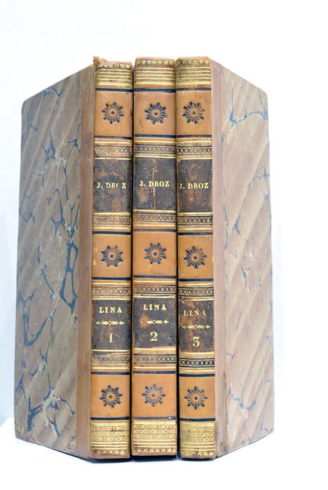 3 tomes en 3 volumes. 2 feuillets. VII. 197 pages. + 2 feuillets. 263 pages. + 2 feuillets. 175 pages. (17,5x10,5 Cm). Demi-veau tabac. Dos lisses ornés. Coins et coiffes légèrement émoussés. Petits défauts à la coiffe et au plat supérieur du tome 3. Roman épistolaire de l'historien et moraliste Joseph. Membre de l'Académie française, Droz composa plusieurs ouvrages de philosophie, d'économie et de politique, et fut un auteur apprécié de son temps. Rousseurs et mouillures. Sinon en très bon état.