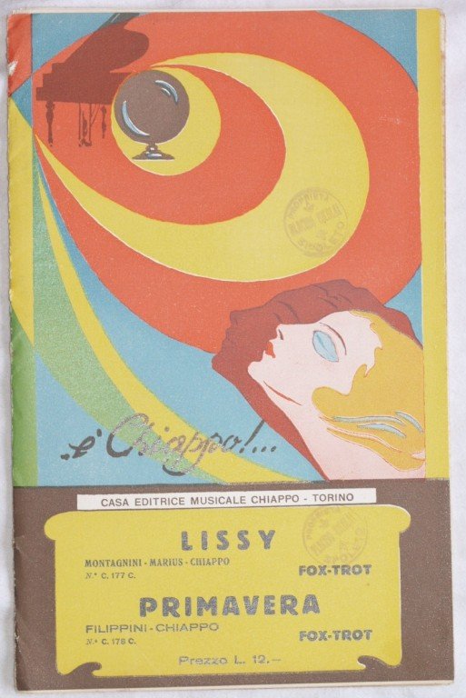 In 8. cm 27x17,5. pp 49. partitura completa per orchestra del 1933 di due canzoni. Caratteristica copertina d'epoca. Ex libris sulla copertina ed in qualche pagina. Ottime condizioni. a complete score for orchestra of 1933. Carachteristic decorated cover of that period. Ex libris in the cover and in some pages. Very good conditions.