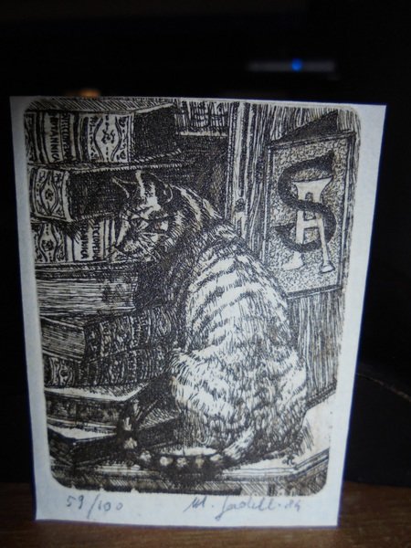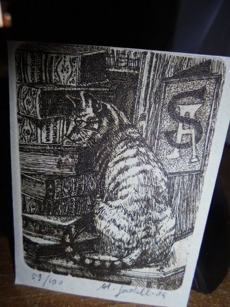 Litografia in miniatura (60 x 45 mm.) su carta incisione Marc Sardelli raffigurante un gatto fra i libri. 59 su 100. Firmata e datata 1984. Scat. illustrata mens. (figura uva)