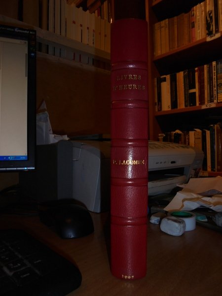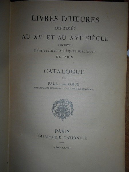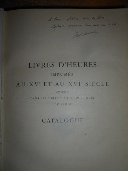Paul, Lacombe. Paris, Imprimerie Nationale, 1907. LIVRES D' HEURES Imprimés au XV et au XVI Siècle conservés dans les Bibliothequès Publiques de Paris. In-8°, m. marocchino cilindrato con grandi angoli, dorso a nervi con titoli in oro. LXXXIV, 438, (1) pp. Bellissimo esemplare della prima edizione con le brossure originali conservate impreziosito da una dedica firmata dall' Autore ad un amico. Uff. E - I - 3