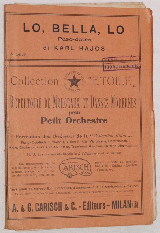 In 8. cm 27x19. Pp 26. partitura completa per orchestra senza data ma degli anni '30 di una canzone. Caratteristica copertina illustrata d'epoca. In buone condizioni. a complete score for orchestra not dated but of 1930's. Carachteristic decorated cover of that period. In good conditions, wearings.