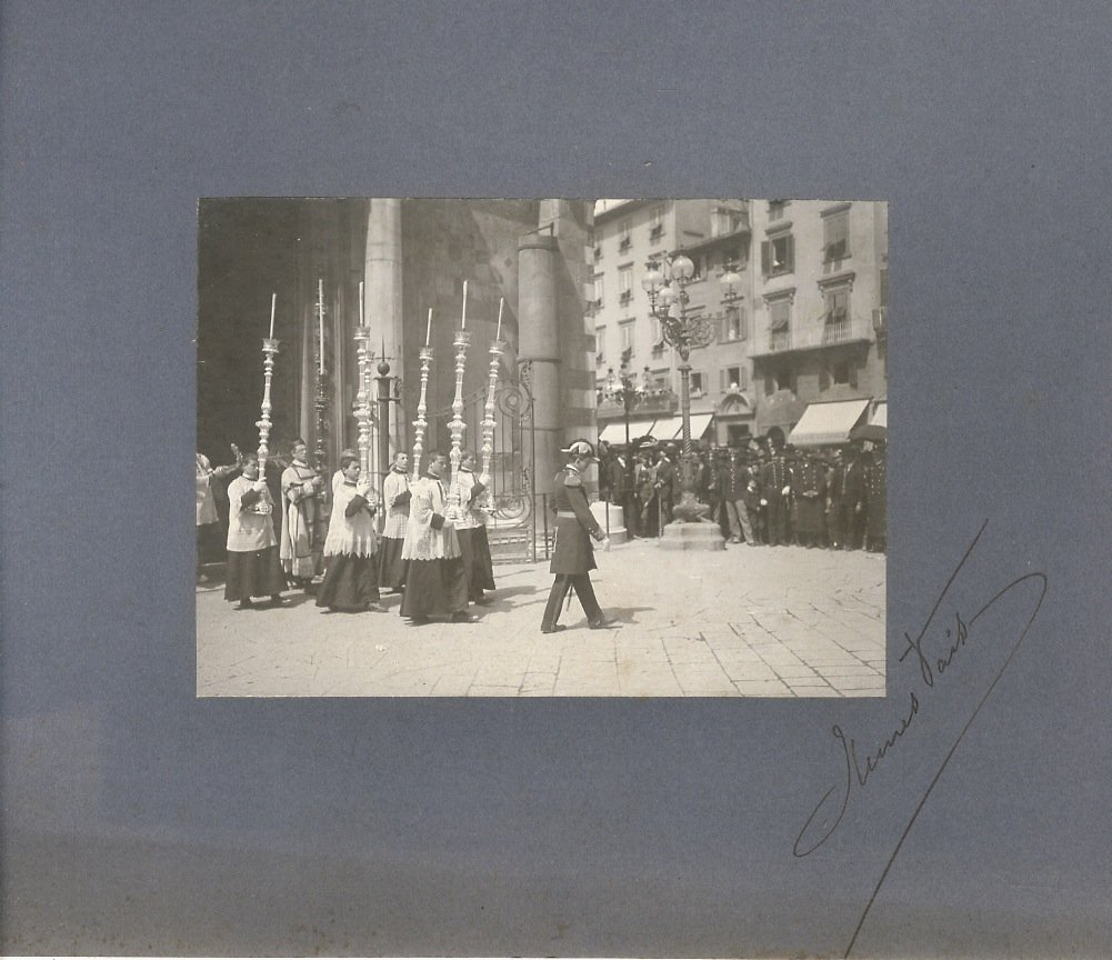 [Firenze, anni '20 del '900]. Fotografia originale, mm. 165x117. Applicata su cartoncino grigio. Firmata sul cartoncino nell'angolo basso a destra. Raffigura una processione di prelati che escono dal Battistero.