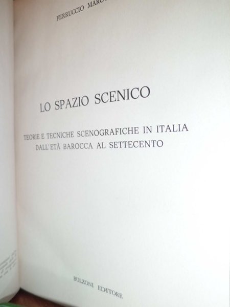 Lo Spazio Scenico. Teorie e tecniche scenografiche in Italia dall' età Barocca al Settecento. Ferruccio, Marotti. Roma, Bulzoni Editore, 1974. In - 16° grande, tutta tela azzurra con tassello e titolo in oro. 140 pp. con XXIV tavole in bianco e nero fuori testo. Esemplare in stato di nuovo. Negozio esot. 72 dietro