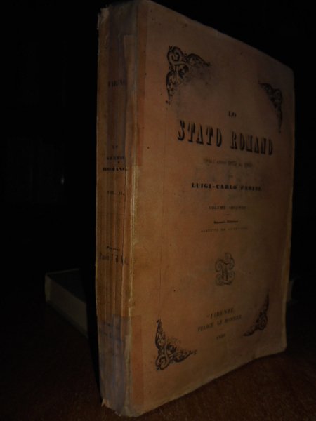 Luigi-Carlo Farini. Firenze, Felice Le Monnier, 1850. Lo Stato Romano dall' anno 1815 al 1850. Volume secondo 1850. In-16°, br. cop. orig. 397 pp. Sono presenti gli usuali segni del tempo. Neg. mob. 3