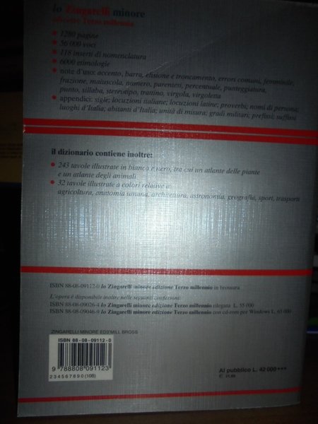 Nicola, Zingarelli. Bologna, Zanichelli, 2001. In-8°, cartoncino edit. ill. a colori. Edizione Terzo millennio. 1248 pagine, 56000 voci, 118 inserti, 6000 etimologie, etc. Inoltre 243 tavole illustrate in nero, tra cui un atlante delle piante e un atlante degli animali. 32 tavole illustrate a colori raffiguranti varie materie. In ottimo stato di conservazione. Neg. scienze mob. R. dietro