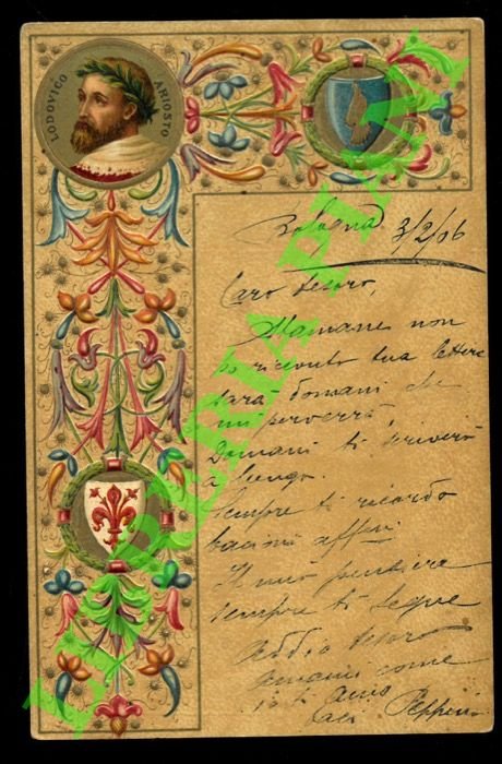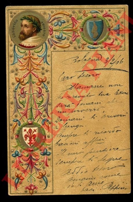 Cartollna postale cromolitografica e in rilievo, 1906, scritta ma non viaggiata, ritratto del letterato, stemmi e fregi ornati.