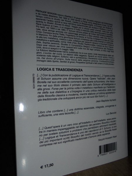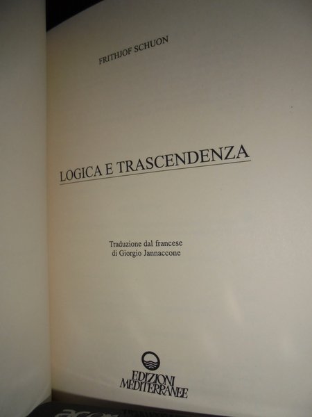 Frithjof, Schuon. Roma, Edizioni Mediterranee, 2013. Logica e trascendenza. Traduzione dal francese di Giorgio Jannaccone. In-8°, cart. edit. 323 pp. In stato di nuovo. Neg. mob. bianco