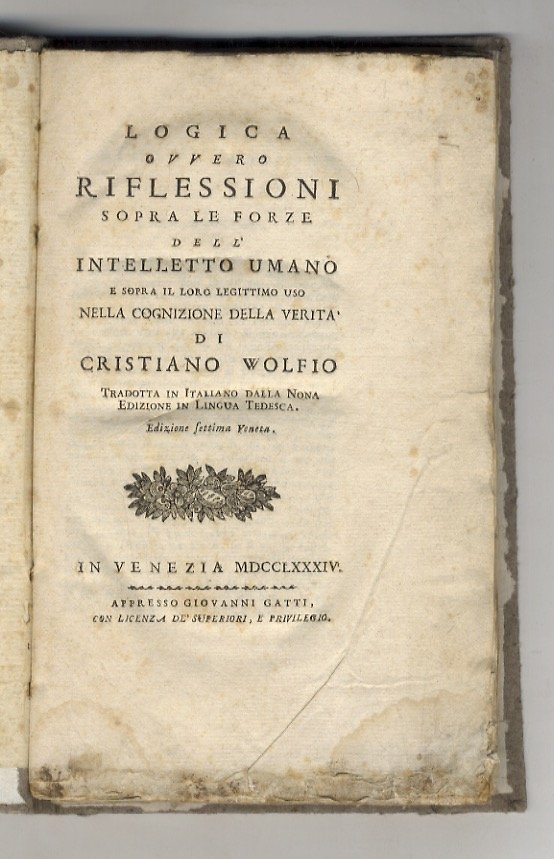 Logica ovvero riflessioni sopra le forze dell'intelletto umano e sopra il loro legittimo uso nella cognizione della verità di Cristiano Wolfio tradotta in italiano dalla nona edizione in lingua tedesca. Edizione settima veneta.