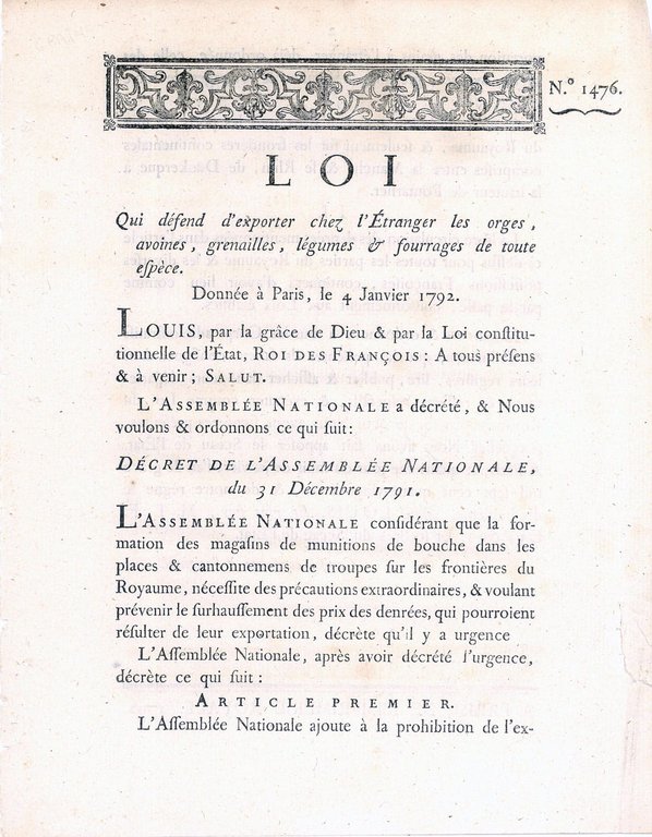 LOI qui défend d'exporter chez l'Étranger les Orges, Avoines, Grenailles, Légumes et Fourrages de tout espèce.