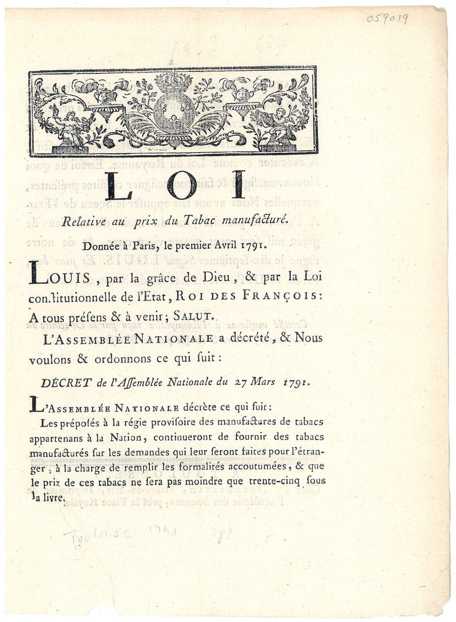 2 pages. (25x20,5 Cm). Dérelié. Loi qui décrète le prix des tabacs à minimum 35 sous la livre.