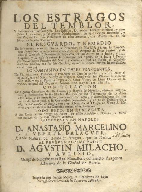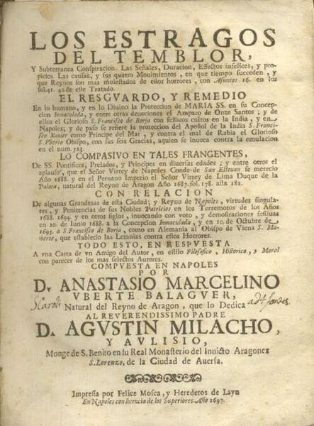 LOS ESTRAGOS DEL TEMBLOR. Y Subterranea Conspiracion. Las Señales, Duracion, Effectos infelices, y propicios. Las causas, y sus quatro Movimientos, en que tiempo succeden, y que Reynos son mas molestados de estos horrores, Con Asuntos 16. en los fol.41. 42 de este Tratado. El resguardo, y remedio en lo humano, y en lo Divino la Proteccion de Maria SS. en su Concepcion Immaculada, y entre otras devociones el Amparo de Onze Santos; y de ellos el Glorios S. Francisco de Borja con festivos cultos en la India; y en Napoles …. Lo compasivo en tales frangentes, de SS. Pontefices, Prelados, y Principes en diuersas edades; . Con relacion de algunas Grandezas de esta Ciudad.compuesta en Napoles por D. Anastasio Marcelino Vberte Balaguer, natural del