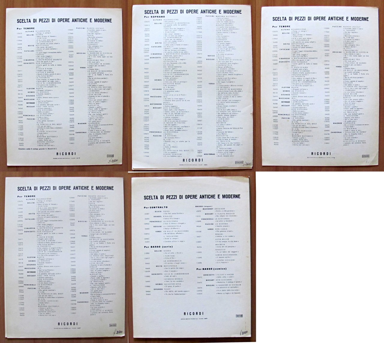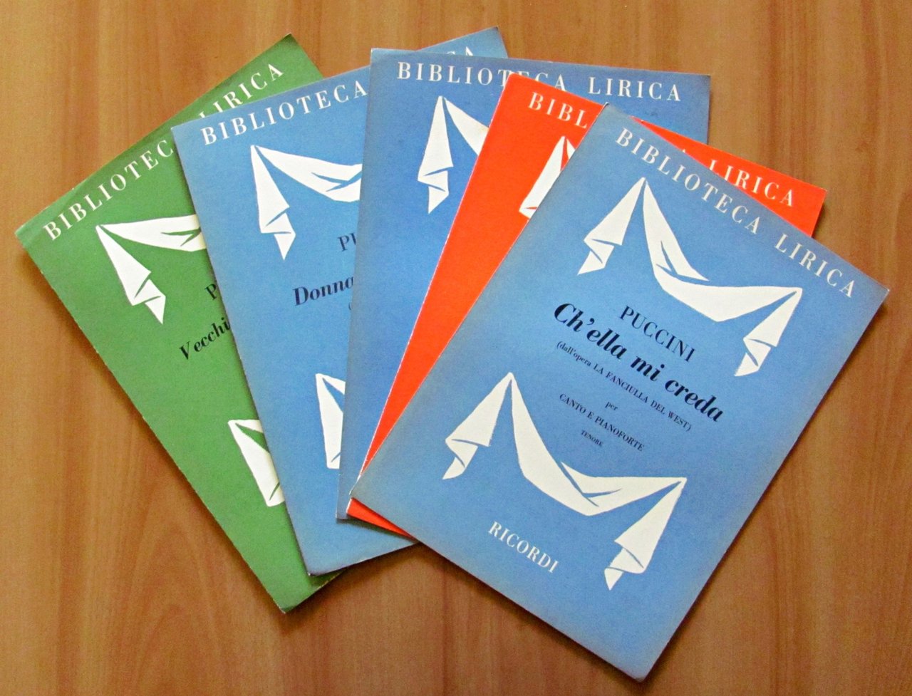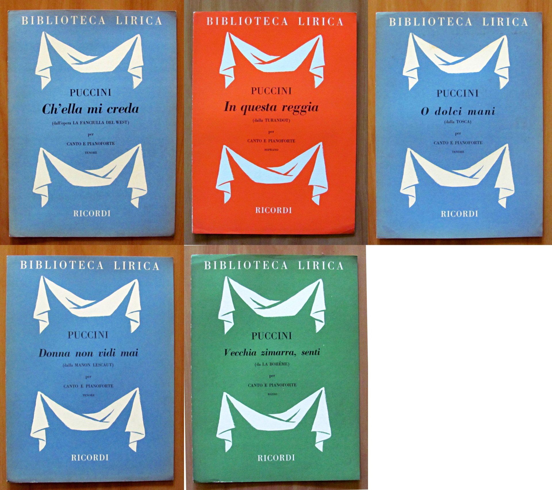 Vecchia zimarra, senti (da La Bohéme), Donna non vidi mai (dalla Manon Lescaut), O dolci mani (dalla Tosca), In questa reggia (dalla Turandot), Ch'ella mi creda (dall'opera La Fanciulla del West). Ed. Ricordi - Milano, 1954-1955-1956. Brossure editoriali. 24x32. OTTIMO STATO , Ottimo (Fine)