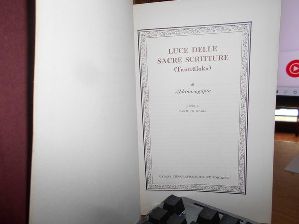 A cura di Raniero Gnoli. Torino, U.T.E.T., 1972. Luce delle sacre scritture (Tantrāloka) di Abhinavagupta. Prima edizione. In-8°, tela edit. con frefi e titolo in oro al dorso, sovracopertina in acetato. 900 pp. con 7 tavole fuori testo. In ottimo stato di conservazione con insignificanti segni del tempo e strappetti marginali nella sovracopertina in acetato Uff. stanz. TV mob. nostro