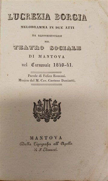 LUCREZIA BORGIA. Melodramma in due atti da rappresentarsi nel Teatro Sociale di Mantova nel Carnovale 1840-41. Parole di. Musica del M. Cav.