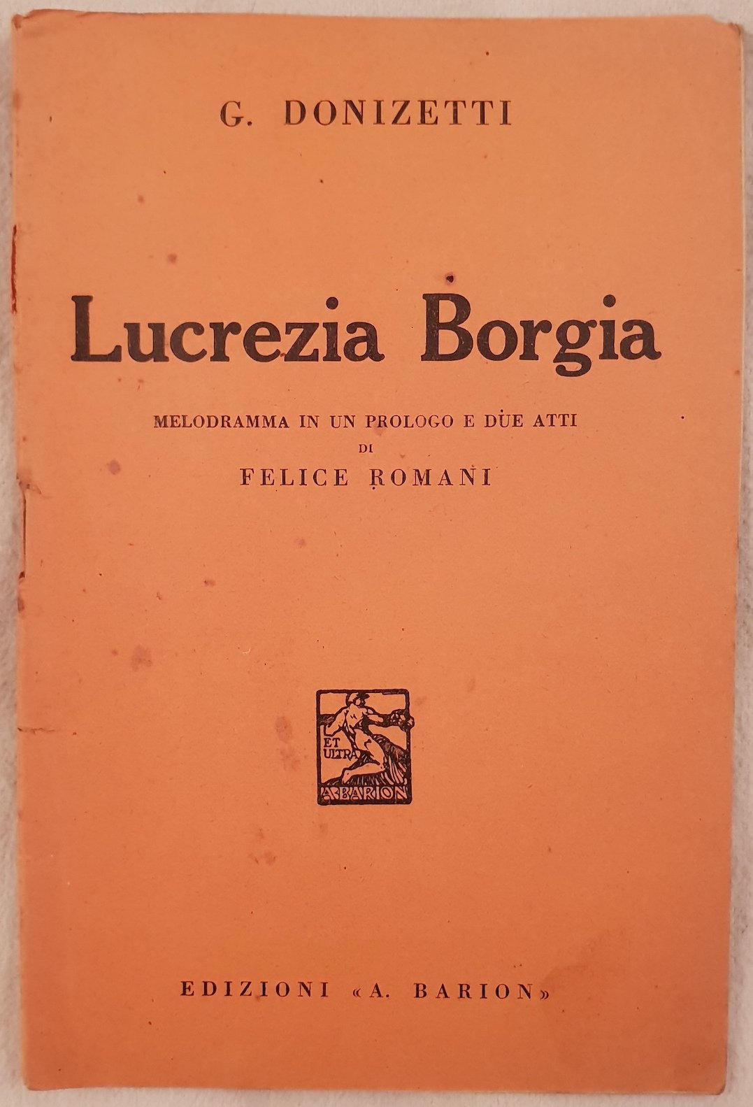 Edizione del 1936 di questo libretto d'opera del dramma "Lucrezia Borgia" di Domenico Gaetano Donizetti (1797-1848). La prima dell'opera, ebbe luogo a Milano, Teatro La Scala il 26 Dicembre 1833. In buone condizioni. Copertina editoriale in buone condizioni generali con lievi usure ai margini e dorso. Legatura in buone condizioni. All'interno le pagine si presentano in ottime condizioni con rare fioriture. In 16. cm 18,5x12. Pp. 32. Edition of 1936 of this booklet "Lucrezia Borgia" by Domenico Gaetano Donizetti (1797-1848) . The first representation of the work took place in Milan, Teatro La Scala the 26th of December 1833. Editorial cover in good general conditions slightly worn in the edges and spine. Binding in good conditions. Isndie pages are in very good conditions with occasional foxings