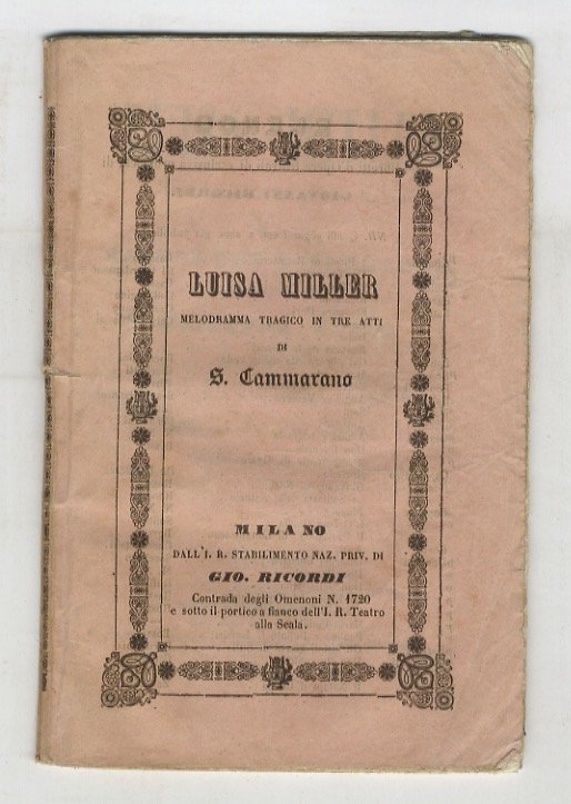 Luisa Miller. Melodramma tragico in tre atti di Salvadore Cammarano. Musica del maestro Giuseppe Verdi. Da rappresentarsi all'I.R. Teatro degl'Immobili posto in via della Pergola la Quaresima del 1851.