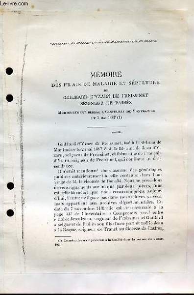 M�moire des Frais de Maladie et S�pulture de Gailhard d'Yzarn de Freissinet, seigneur de Padi�s. mortellement bless� � Castelanu de Montradier, le 3 mai 1487