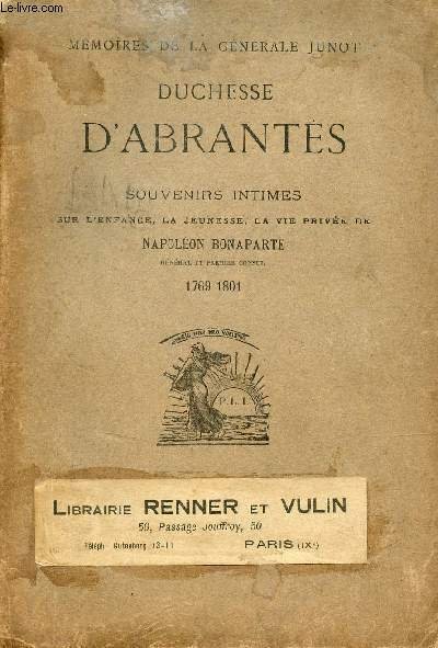 M�moires de la G�n�rale Junot Duchesse d'Abrant�s souvenirs intimes sur l'enfance, la jeunesse, la vie priv�e de Napol�on Bonaparte g�n�ral et premier consul 1769-1801.
