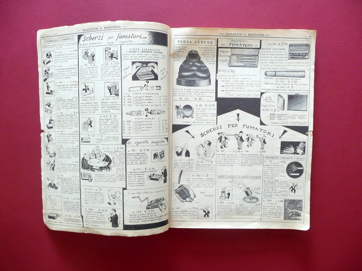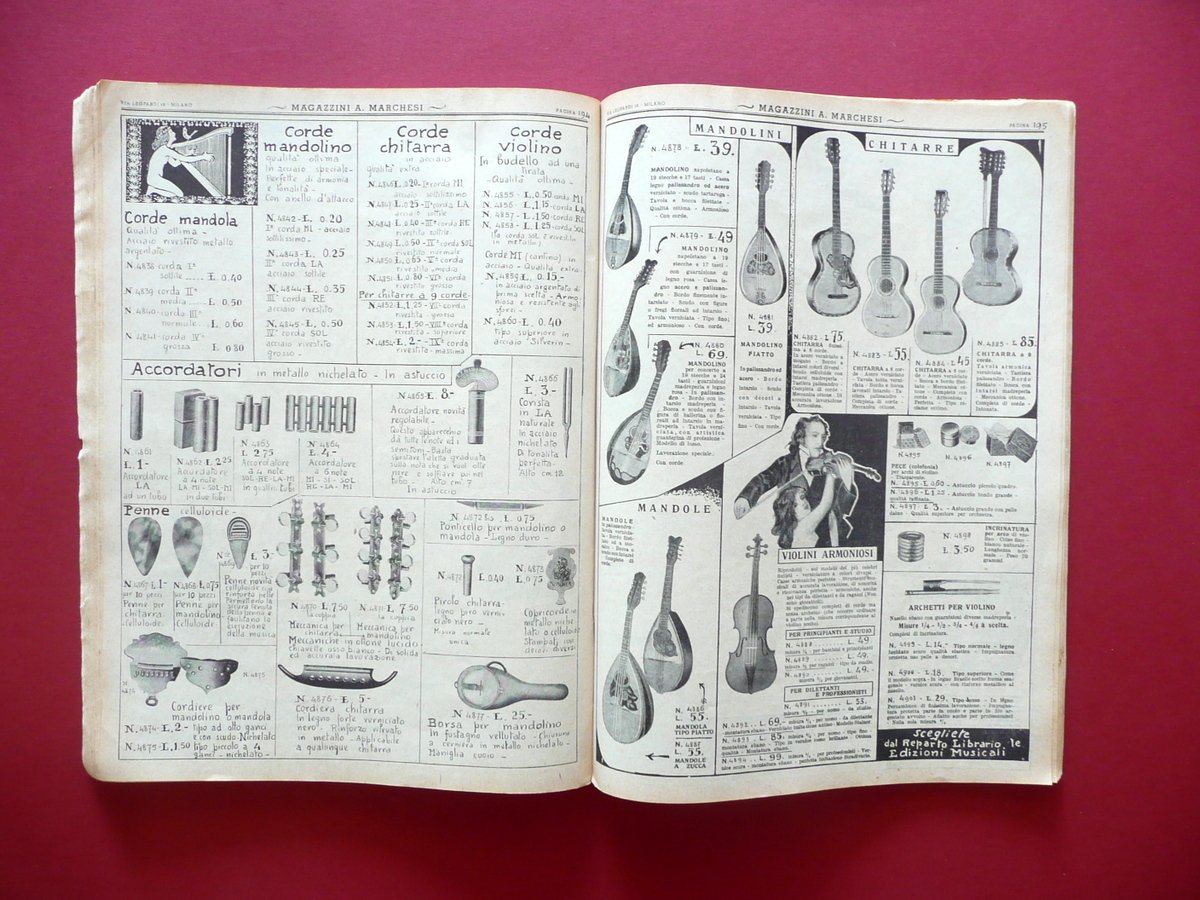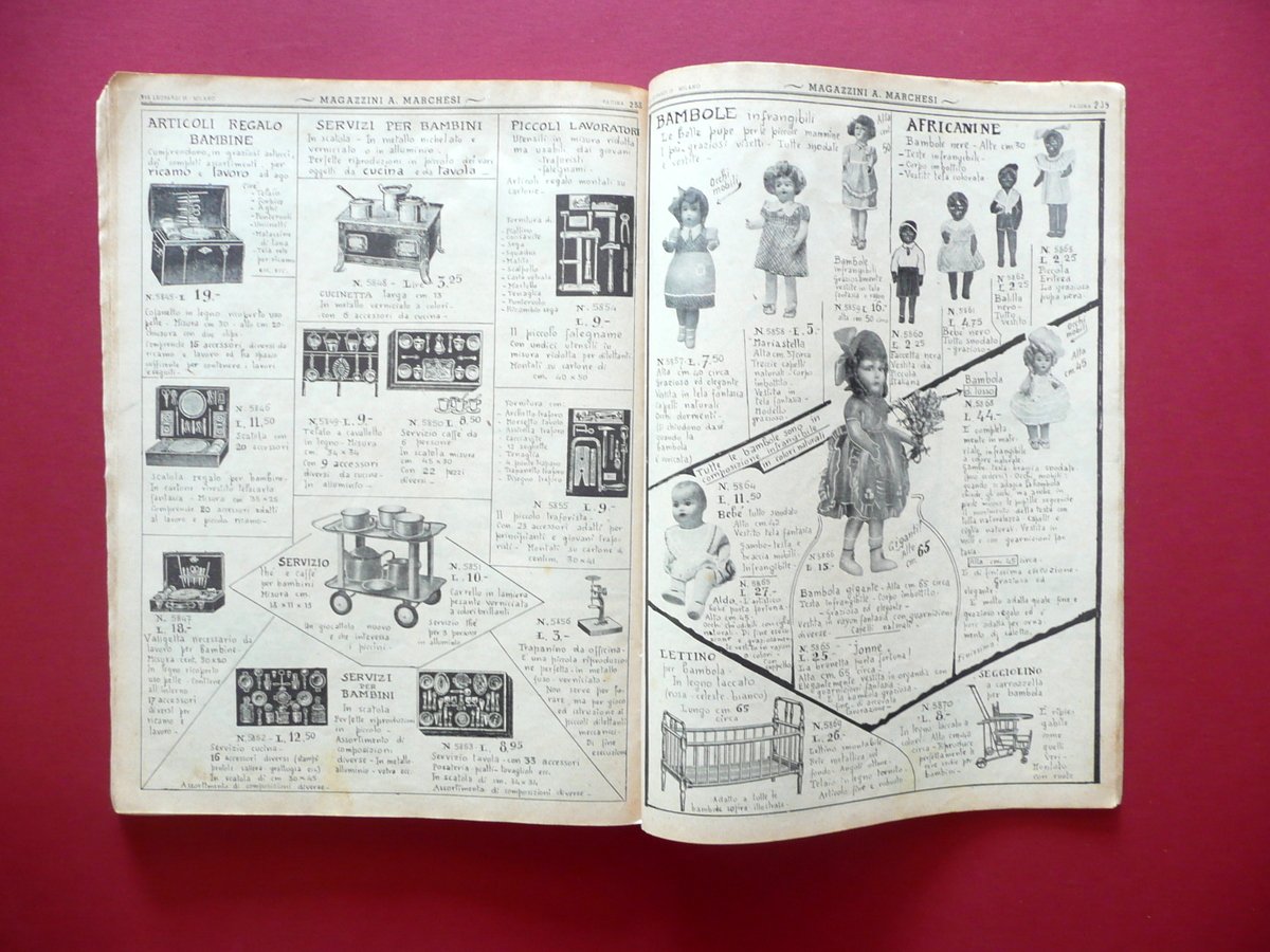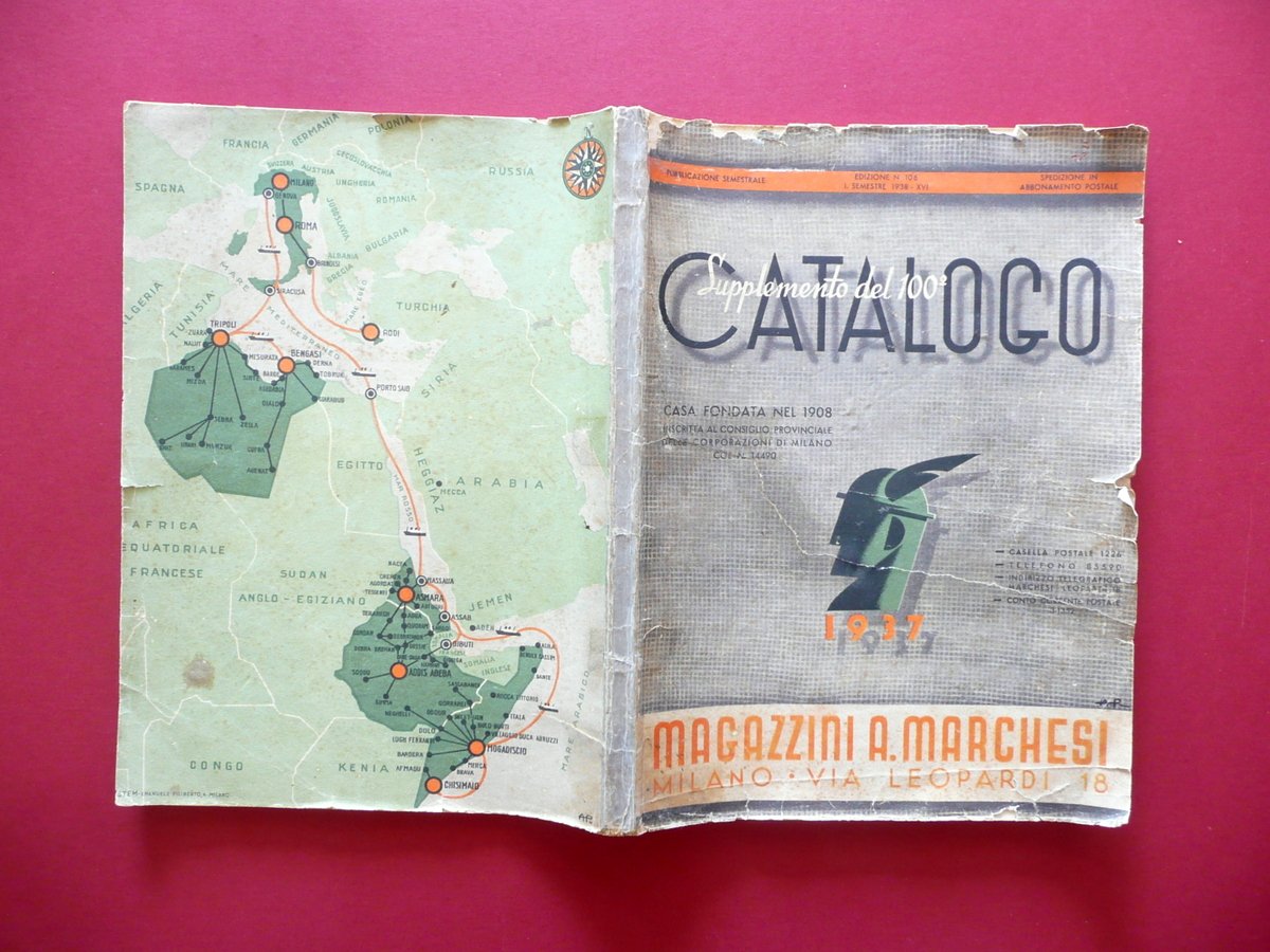 Catalogo, Magazzini A. Marchesi Milano - Via Leopardi 18 Catalogo Supplemento al 100° Edizione numero 106 I° semestre 1938 Milano 1938; cm 28,5x21; pp. 272 con numerosissime ill. in b/n nel t.; brossura ed. ill. a colori. Condizioni di conservazione Esemplare complessivamente in buono stato con tracce d'uso, alcune piccole lievi bruniture, margini e angoli delle brossure con qualche piccola mancanza e minimi strappetti; brossura ant. con uno strappetto di alcuni cm, restaurato al retro mediante nastro per riparazioni cartacee. Angolo sup. delle pp. 271-272 con una mancanza di qualche cm (vedi foto); margine esterno delle pp. 1-16 con una minima mancanza. Interni peraltro buoni. Catalogo che raccoglie numerosissime tipologie merceologiche, con moltissime illustrazioni in bianco e nero nel testo. SETT178.L17024 N