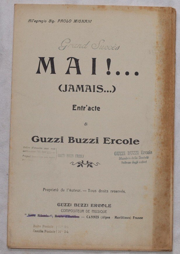In 8. cm 27x18. pp 17. partitura completa per orchestra senza data ma degli anni '30 di una canzone.<BR>Caratteristica copertina illustrata d'epoca. ex libris in copertina ed in alcune pagine. In ottime condizioni; bruniture in copertina. a complete score for orchestra of 1930's. Carachteristic decorated cover of that period. ex libris in the cover and in some pages. In very good conditions; yellowings in the cover.