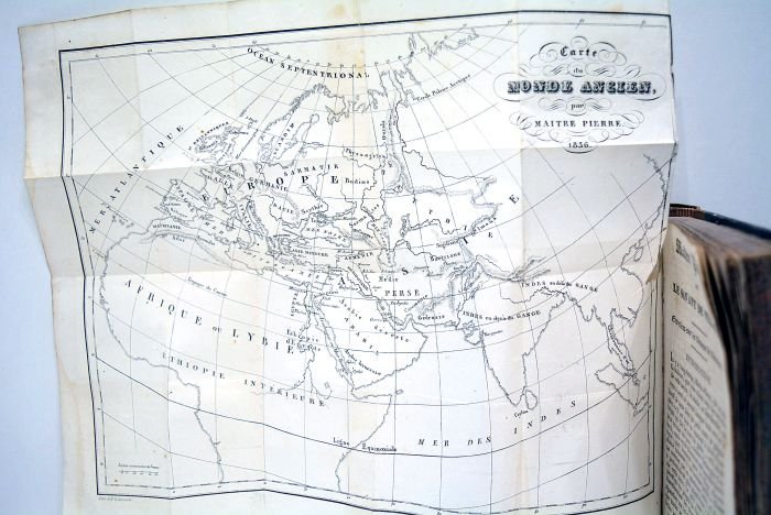 2 livres reliés ensemble. VII. 219 pages. + 2 feuillets. 180 pages. 1 feuillet. (8,5x14,5cm). Demi-basane. Dos lisse orné. Pièces de titre et de tomaison. Plats un peu déformés. Quelques frottements à la couverture. Rousseurs à l'intérieur. Quelques taches et marques de mouillure. Très bon état. Avec 7 planches dépliantes hors-texte : Mappemonde, Afrique, Asie, Amérique, Europe ; Carte du Monde Ancien, Mappemonde pour les voyages et découvertes. Imprimé à Strasbourg.