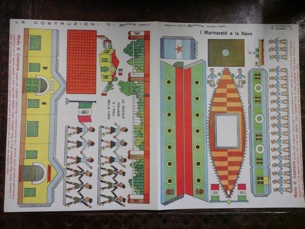 Ottima, bross. ill., 28 cm, viii+32 pp, ill. bn e col. Allegato gioco da ritagliare su cartoncino, foglio ripiegato, ill. a col.: Le Piccole Italiane e i Figli della Lupa + I Marinaretti e la nave
